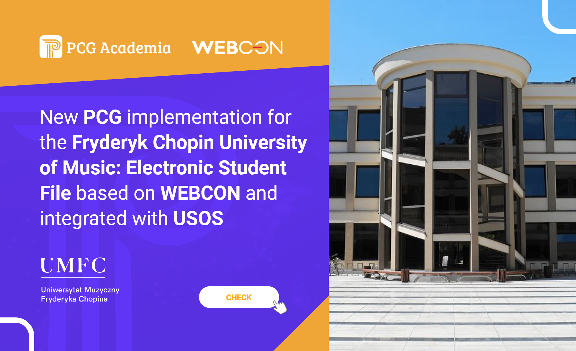 PCG Academia has signed a new agreement with the Fryderyk Chopin University of Music under which it will deliver and implement an Electronic Student File system and electronic student workflows based on the WEBCON platform.