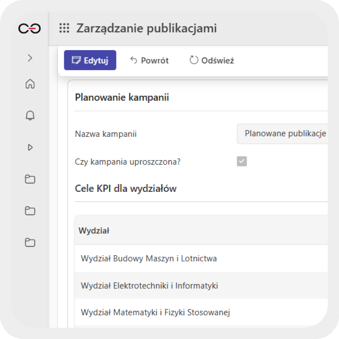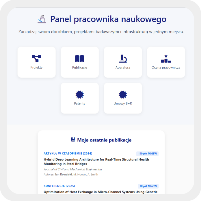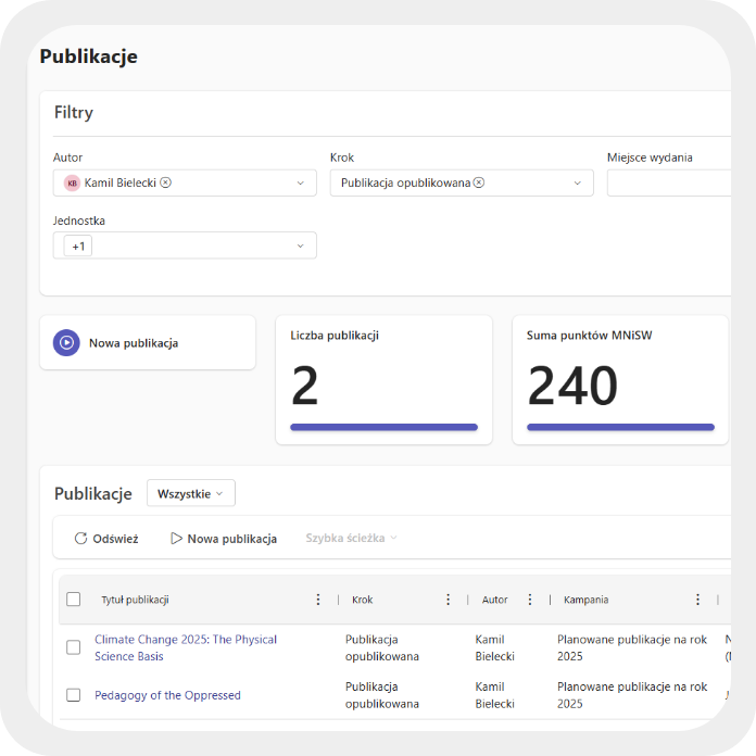 Universities have CRIS systems and repositories that effectively collect data on scientific activity, but they do not support decision-making processes related to science management. WEBCON for Science supplements them with a consistent process layer that transforms scientific data into a real management tool, supporting publication strategy, research project management, and grants.
