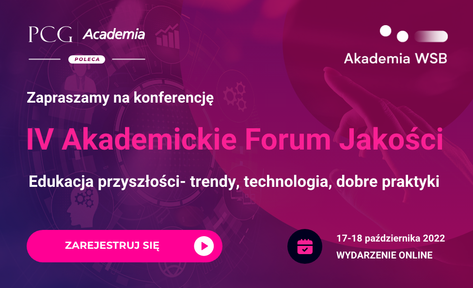 PCG Academia została partnerem tegorocznej edycji konferencji „IV Akademickie Forum Jakości. Edukacja przyszłości – trendy, technologia, dobre praktyki”. Konferencja odbędzie się online w dniach 17-18 października 2022.