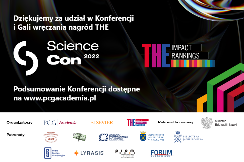 W historycznych murach Uniwersytetu Jagiellońskiego, 18 maja 2022 roku, odbyła się pierwsza edycja międzynarodowej konferencji ScienceCon 2022. Konferencja to nowa, wspólna inicjatywa PCG Academia, Times Higher Education oraz Elsevier. ScienceCon zgromadził ponad 150 przedstawicieli szkół wyższych zainteresowanych profesjonalnym zarządzaniem nauką oraz zrównoważonym rozwojem.