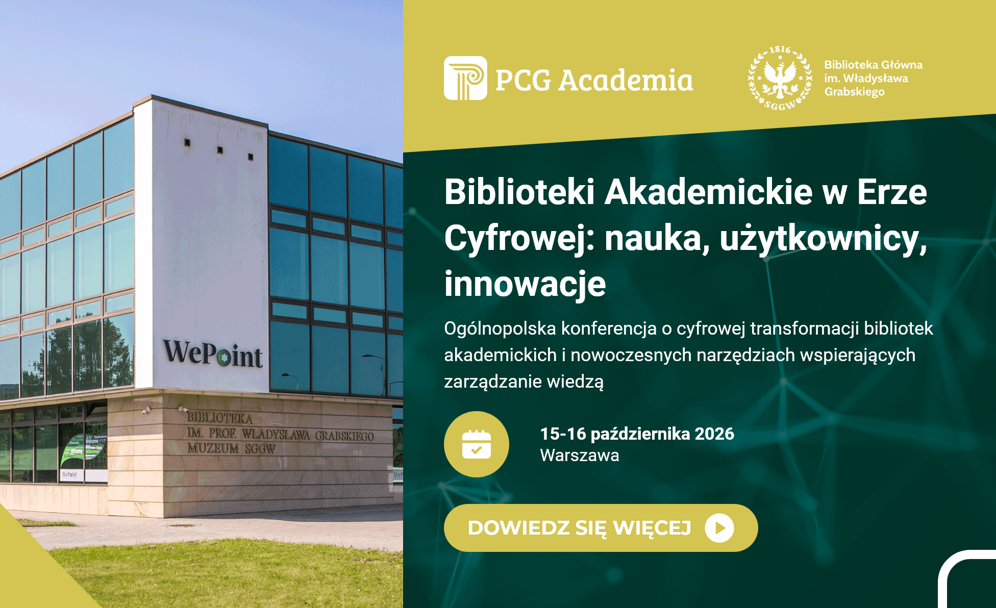 Już 15–16 października 2026 r. w Warszawie odbędzie się ogólnopolska konferencja naukowa „Biblioteki Akademickie w Erze Cyfrowej: nauka, użytkownicy, innowacje”, organizowana przez Bibliotekę Główną im. Władysława Grabskiego w Szkole Głównej Gospodarstwa Wiejskiego w Warszawie. Wydarzenie skierowane jest przede wszystkim do pracowników bibliotek naukowych oraz instytutów bibliotekoznawstwa i informacji naukowej.