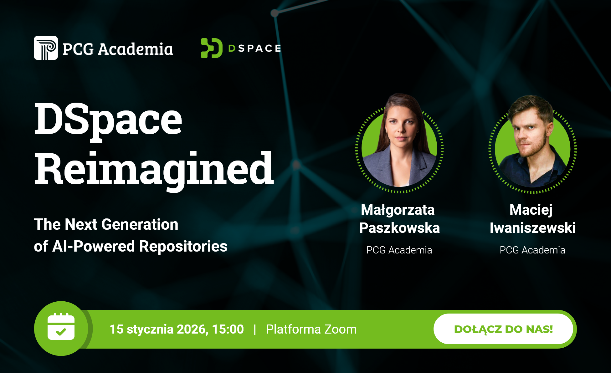 Serdecznie zapraszamy na webinar DSpace Reimagined: The Next Generation of AI-Powered Repositories, który odbędzie się 15 stycznia 2026 r., w godz. 15:00–16:00 czasu polskiego. Wydarzenie organizuje LYRASIS – międzynarodowe konsorcjum opiekujące się oprogramowaniem DSpace.