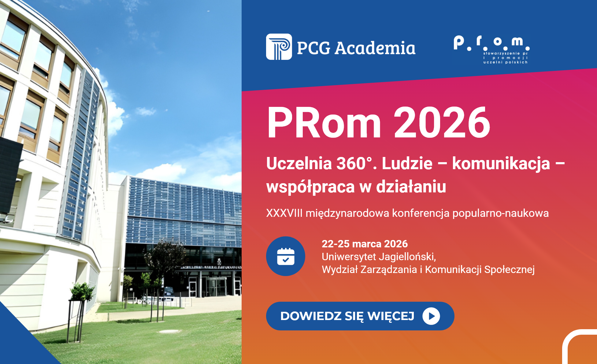 Tegoroczna XXXVIII konferencja PRom, organizowana przez Uniwersytet Jagielloński na Wydziale Zarządzania i Komunikacji Społecznej, odbędzie się w dniach 22-25 marca 2026r. w Krakowie, pod hasłem: „Uczelnia 360°. Ludzie – komunikacja – współpraca w działaniu”. To zaproszenie do rozmowy o tym, jak tworzyć komunikację skuteczną, odpowiedzialną i opartą na relacjach, zrozumieniu oraz wiarygodności.