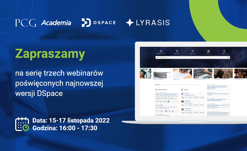 Aby wziąć udział w webinariach, wystarczy dokonać rejestracji na stronie https://pcgacademia.pl/wydarzenia/webinaria/webinaria-lyrasis-o-dspace-7. Serdecznie zachęcamy do uczestnictwa!