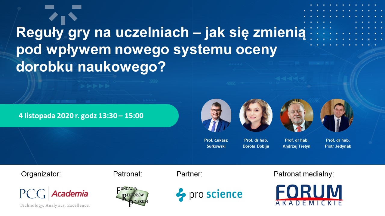 3 listopada 2020 2 min czytaniaSerdecznie zapraszamy na trzeci webinar z cyklu #ocenadorobkunaukowego2.0, gdzie porozmawiamy o tym, jak nowe zasady ewaluacji wpływają na uczelnie. Cykl organizujemy pod patronatem Fundacji Rektorów Polskich i Forum Akademickiego, a naszym partnerem jest firma ProScience.